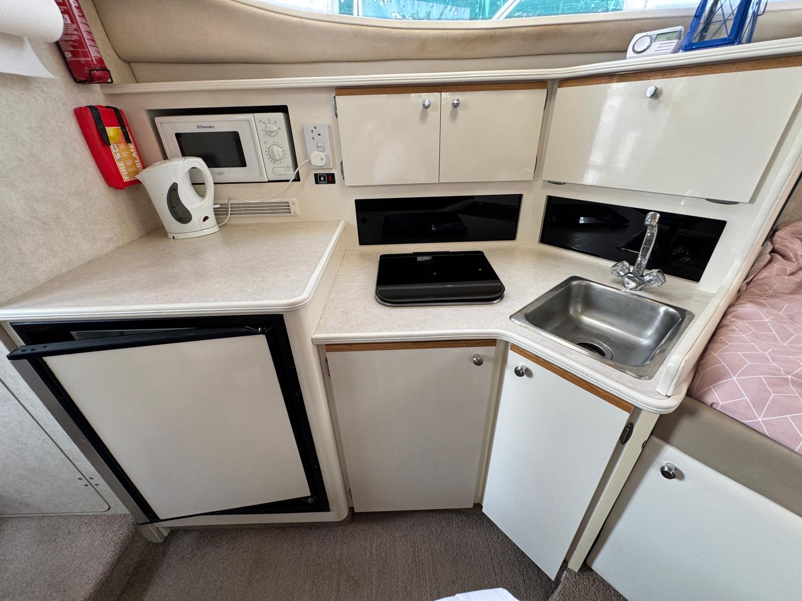 Next is the galley which benefits from an electric hob, microwave, large fridge and ample work surface and storage, single sink with hot and cold water via the calorifier/immersion.